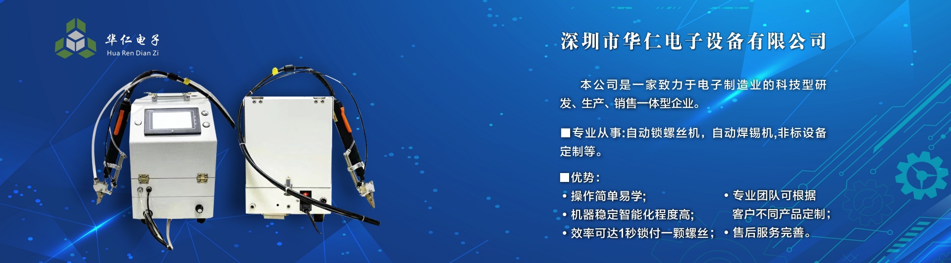 深圳市華仁電子設備有限公司是一家致力于電子制造業周邊設備的科技型研發、生產、銷售一體的企業,專業從事:自動鎖螺絲機;自動焊錫機;非標設備定制機等,公司長期以來在行業中積累了豐富的經驗,擁有專業的研發、技術、銷售支持工程團隊、各高級技術人才為客戶提供優質產品和服務,同時不斷吸取國內外先進技術,更準確及時地為客戶提供優質,性價比高的產品、公司以專業的售前、售中、售后服務贏得了客戶的信賴和好評,為客戶提供先進自動化設備一體式解決方案、